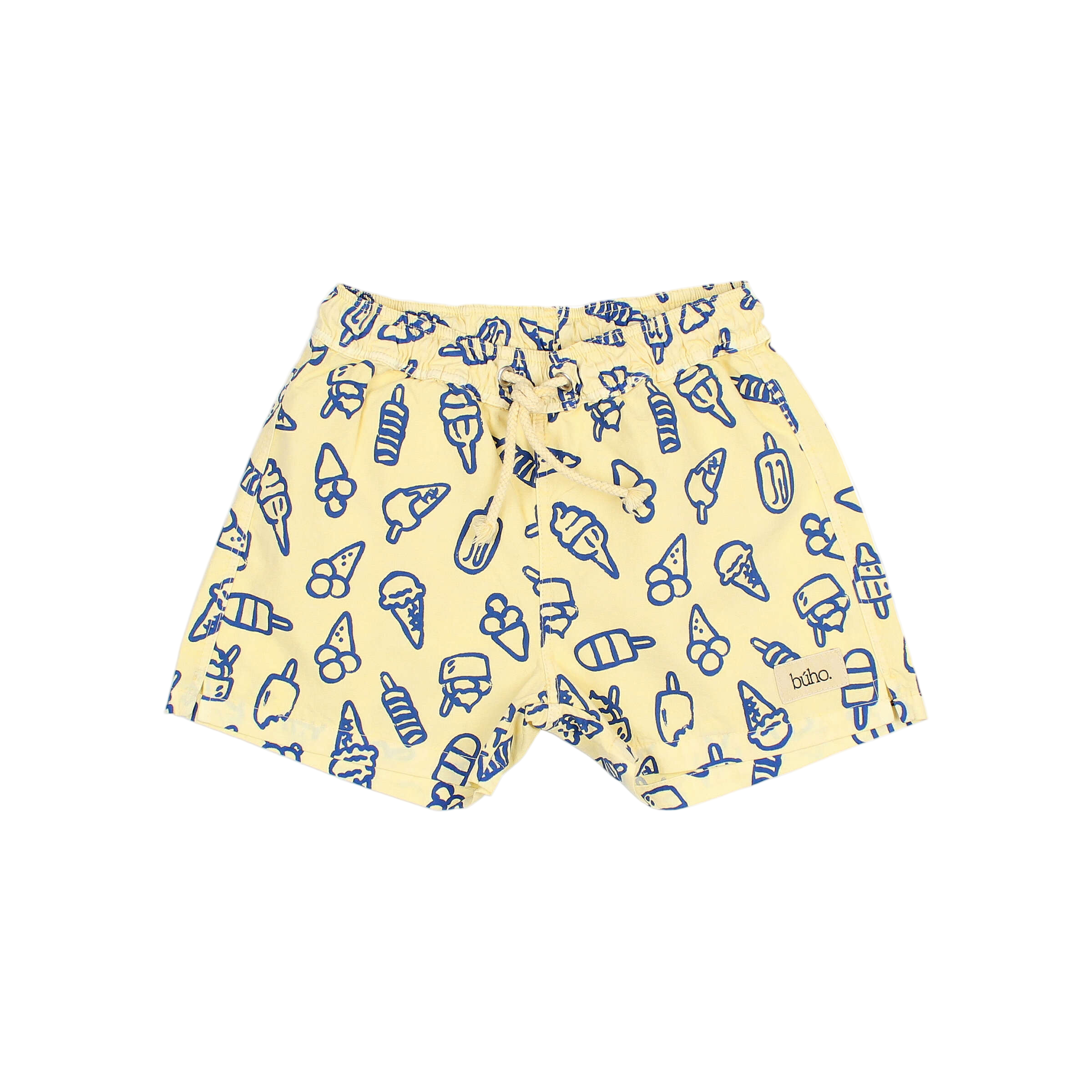 Organic cotton swimsuit with ice cream print. Elastic waistband for a better fit. Matching cotton drawstring at the waist. Decorative label on the back.