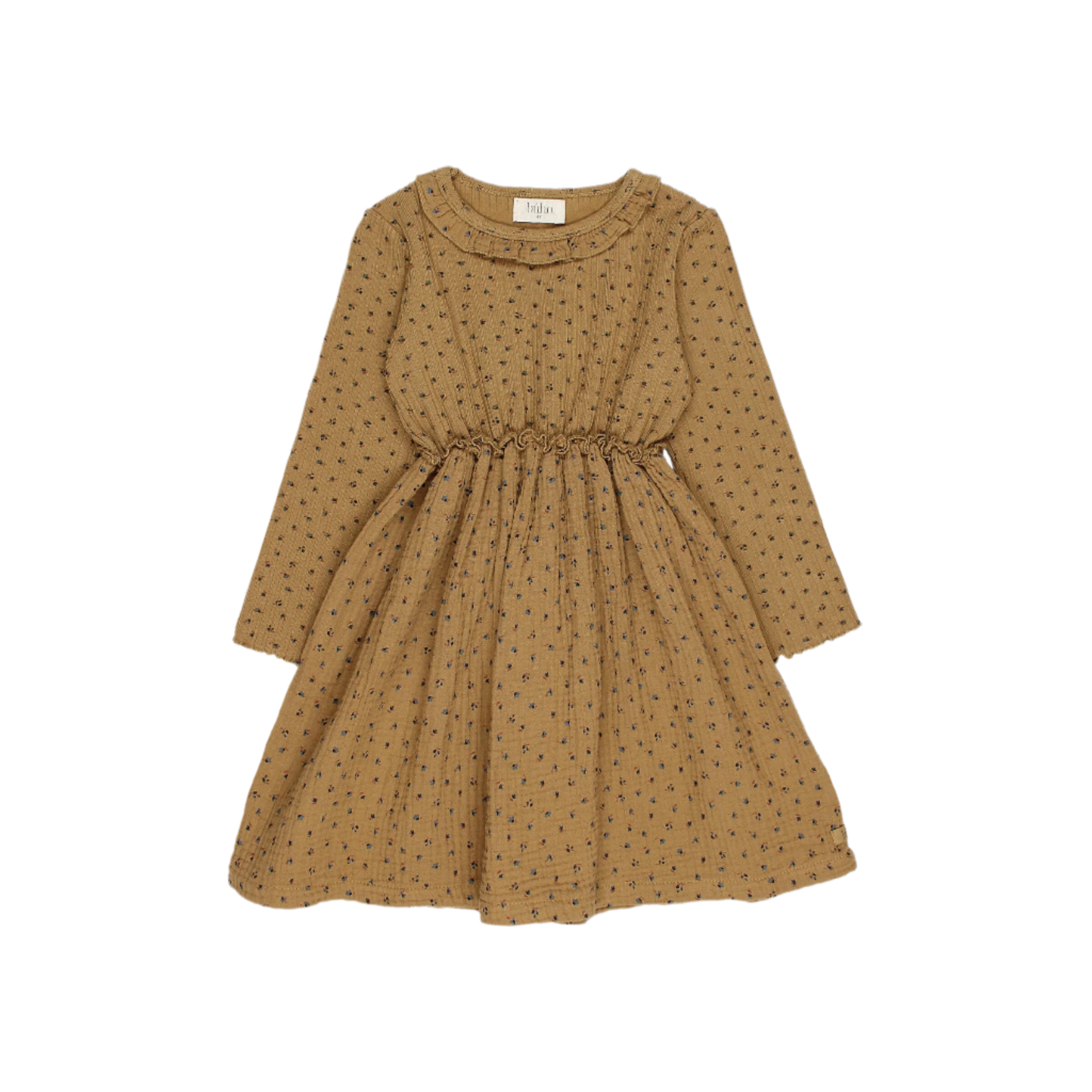 Combined dress with "fall" print. Long sleeve ribbed body with overlapping gathered muslin skirt. Round neckline with ruffle. Muslin skirt with ruffle.