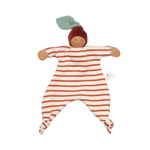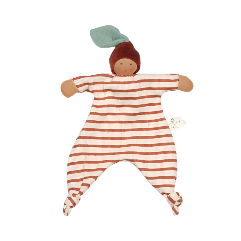 Nanchen Natur “Kastanje baby”. Lief popje van de Duitse poppenfabrikant Nanchen Natur. Het lijfje is gemaakt van gestreepte ripsstof. Aan de muts van de pop hangt een klein blaadje. De baby heeft een fijn belletje en er zijn nog veel meer details voor kleine handjes om te ontdekken. Ideaal als eerste grijpspeeltje, knuffeldoekje of speelpop.